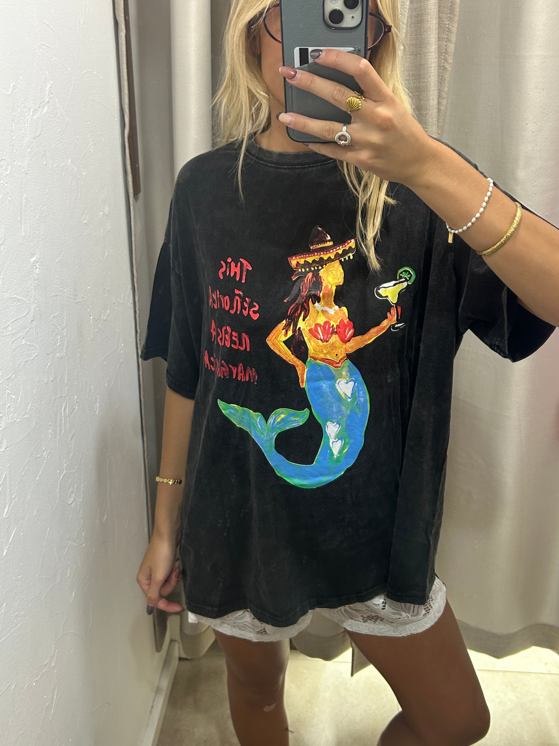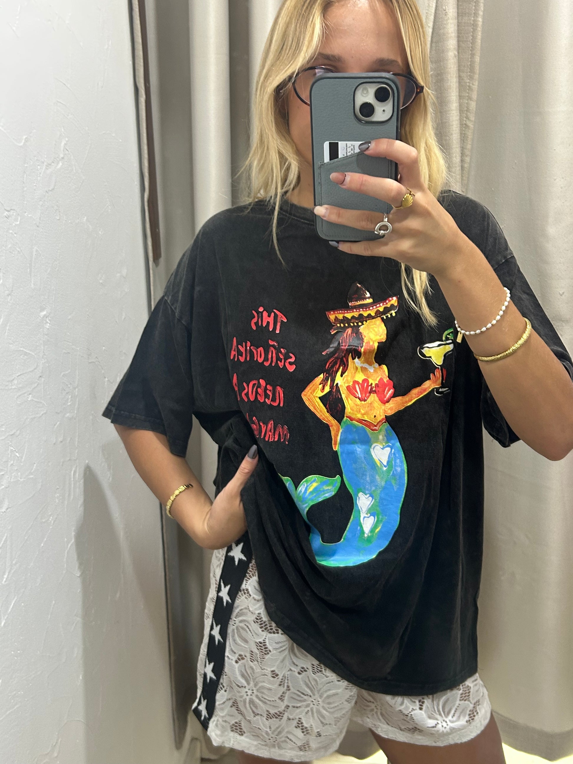 This black acid wash tee brings effortless edge with a playful Señorita Margarita graphic. Crafted from soft cotton for all-day comfort, it’s the perfect casual statement piece to style with denim, shorts, or layered looks. Relaxed, fun, and unmistakably Frankie.