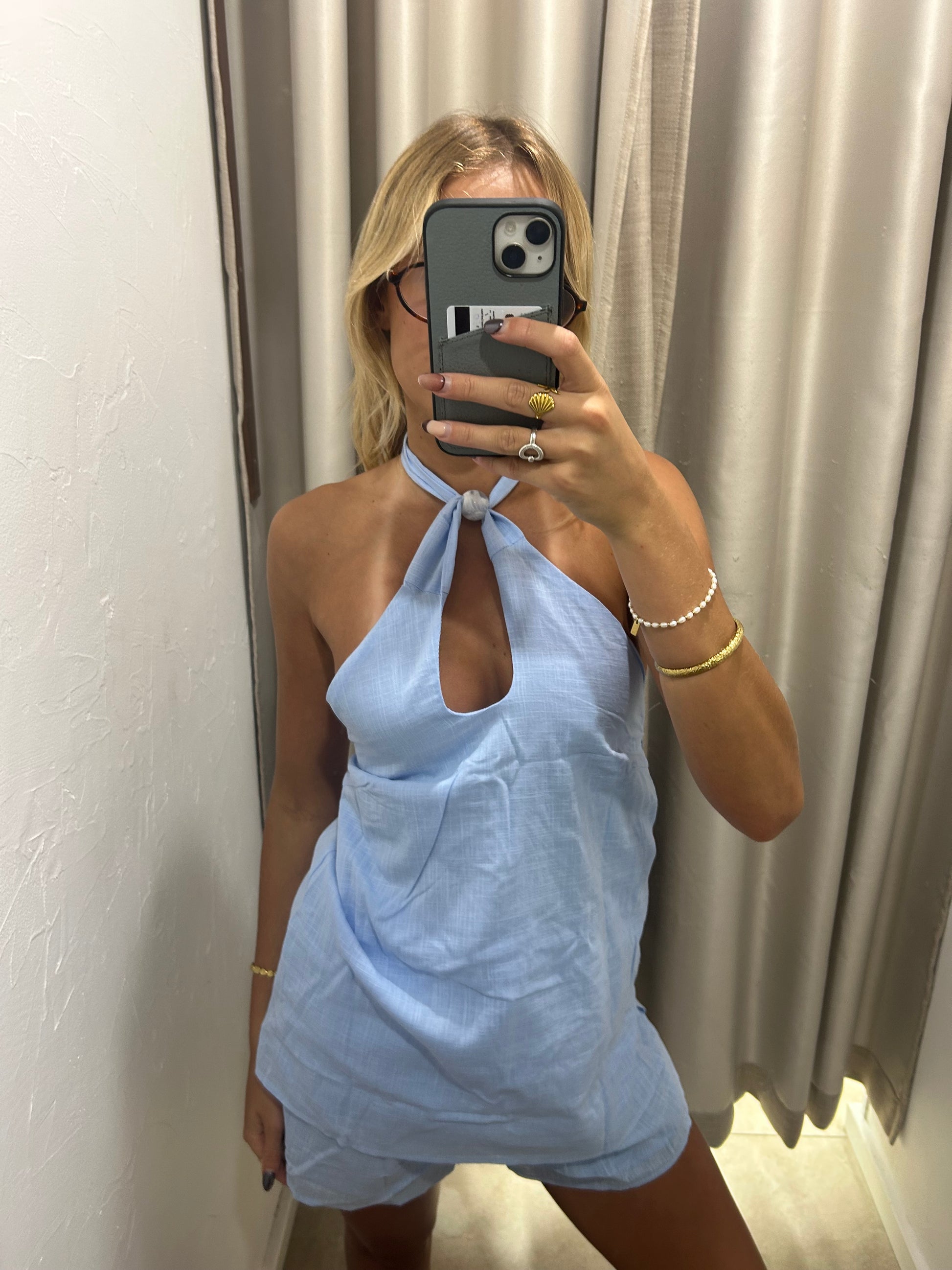 The Blue Beaded Cotton Halter Top features breathable cotton fabric with delicate hand-beaded details for a refined yet relaxed look. Designed with a flattering halter neckline, itβs perfect for warm-weather styling and pairs effortlessly with the matching shorts for a polished Frankie set.
