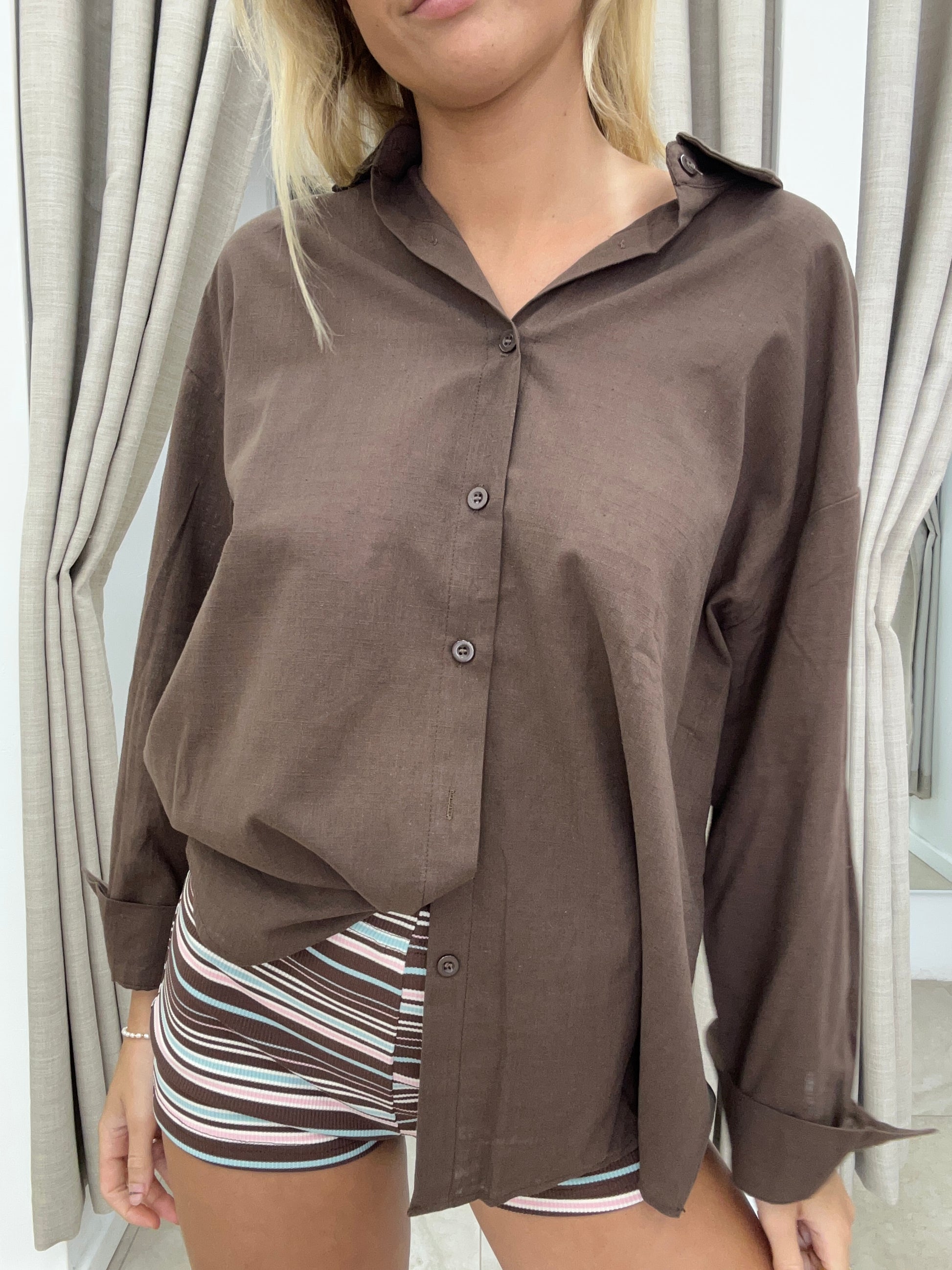 Charming chocolate and pink striped shorts, match with the chocolate cotton shirt for a coordinated look. This set brings together comfort and style in a classic colour combination. Perfect for casual days or relaxed weekends, the shorts feature a timeless stripe pattern that complements the collection beautifully. Mix and match with other pieces or wear as a complete set for effortless coordination.