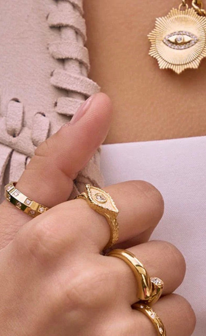 Protect your energy with the enchanting Elysian Ring, an everyday essential with a sparkling touch! Featuring a cool, crushed texture and evil eye design, Elysian is sure to be loved by all making for a truly meaningful gift.