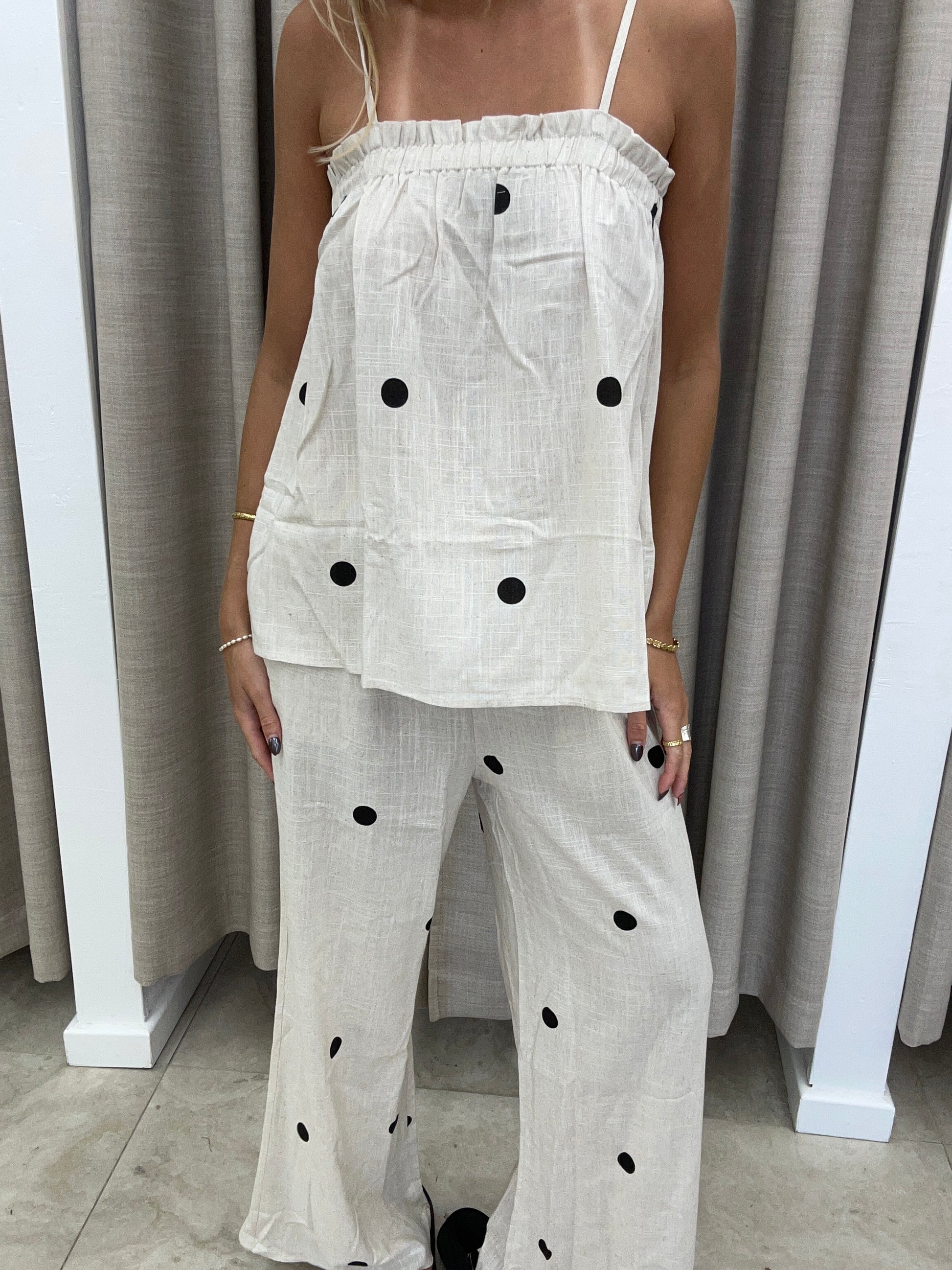 These oatmeal cotton pants feature a timeless polka dot print and a relaxed, flattering fit. Crafted from breathable fabric for all-day comfort, theyโre perfect for effortless styling on their own or paired with the matching top. Easy, polished, and unmistakably Frankie.